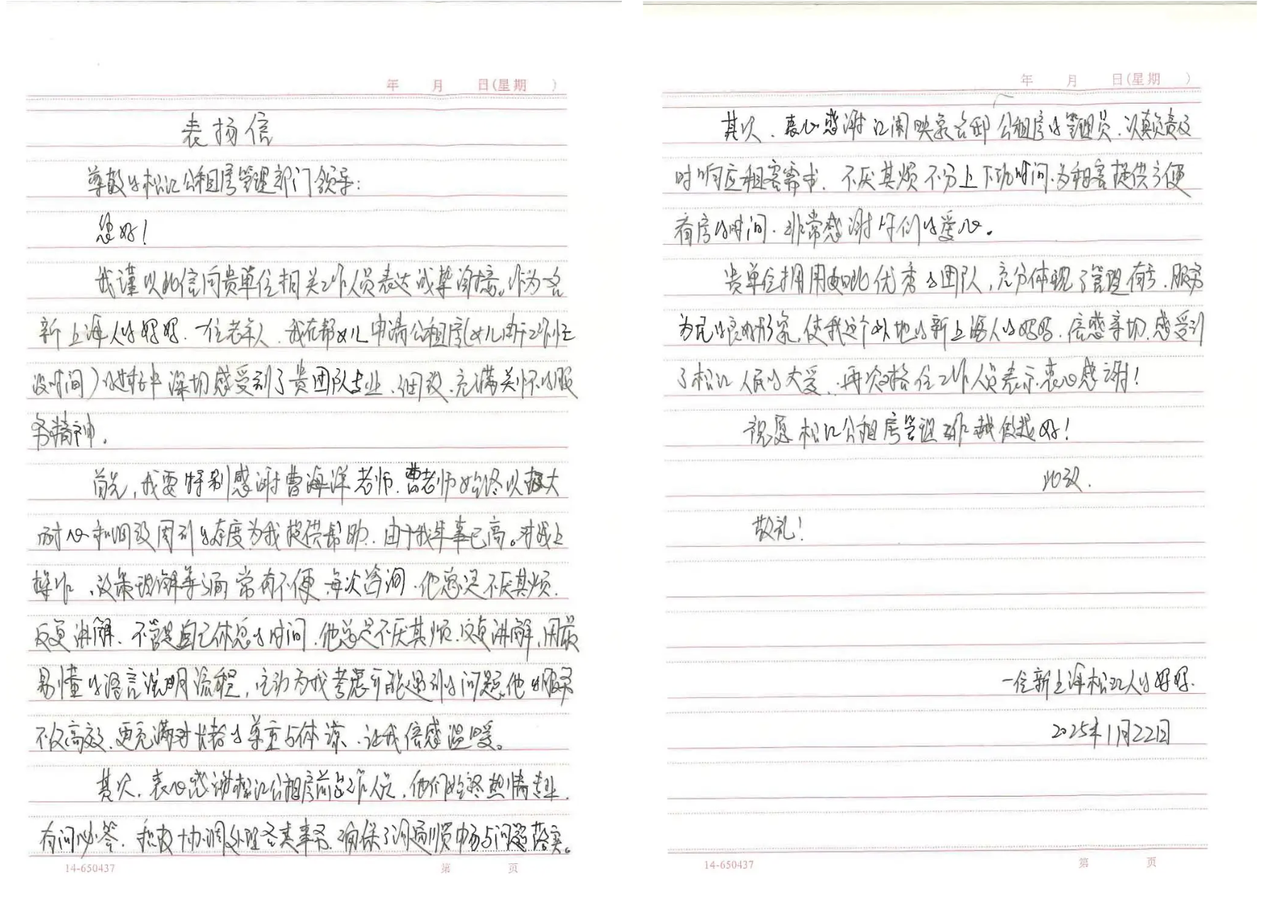 从政策流程的耐心讲解到突发情况的及时协助,松江公租房窗口始终用专业与温情服务每一位群众。近日,公司收到一封来自山东泰安的手写感谢信。一位新上海人母亲,在代为女儿办理公租房申请的过程中,对窗口服务团队的专业、细致与暖心表达了高度认可与真诚感谢,这也成为我们服务日常中温暖的一页。信中提到,由于女儿工作繁忙,这位母亲独自前来...